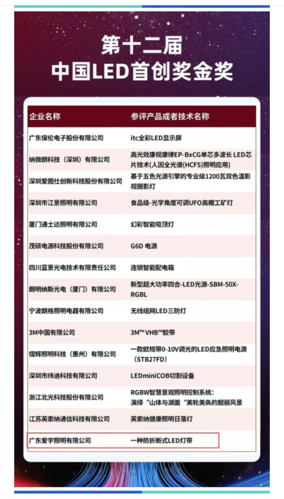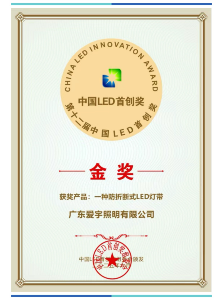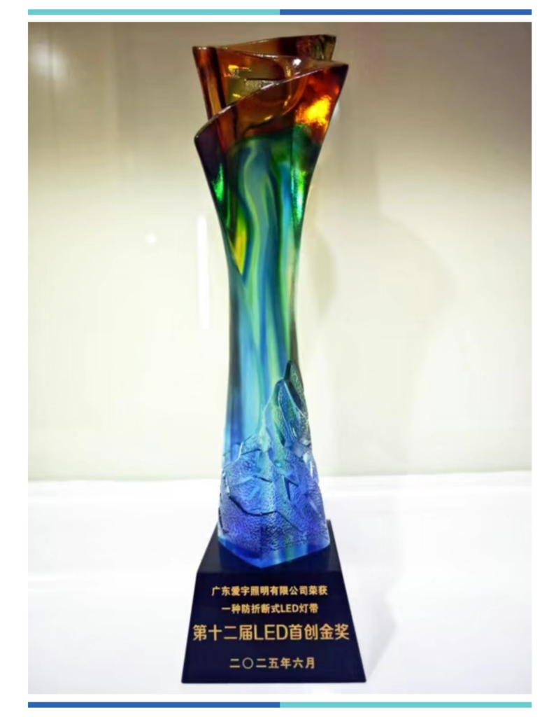 On June 11, 2025, the 12th China LED Pioneer Award Ceremony was grandly held in Guangzhou. Guangdong Aiyu Lighting Co., Ltd. stood out from hundreds of leading enterprises with its independently developed “anti breakage LED strip” and won the China LED Innovation Award Gold Award!